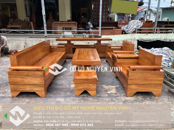 - Bộ bàn ghế Sofa gỗ gõ đỏ loại hai ghế đơn do các nghệ nhân lành nghề tại làng nghề truyền thống Hải Minh tại cơ sở xưởng Đồ gỗ Nguyễn Vinh( huyện Hải Hậu, tỉnh Nam Định ) sản xuất.
